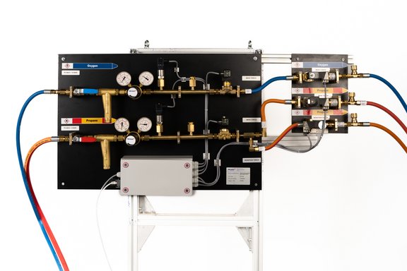 We offer our gas supply panels in your desired design – in combination with our torch system, of course, already perfectly tailored to your needs. Integration into existing supplies is possible without any problems. Monitoring systems, alarm and automation functions can also be integrated into your gas supply. The display of live flow rates or live pressures can also be integrated into the control system by installing flow meters and pressure sensors.